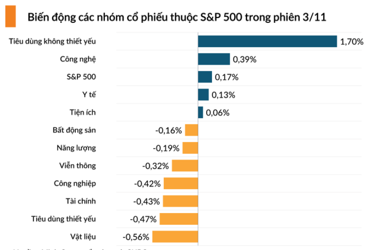 Phiên giao dịch đầu tiên của tháng 11 chứng kiến đà tăng mạnh của cổ phiếu Tiêu dùng không thiết yếu.
