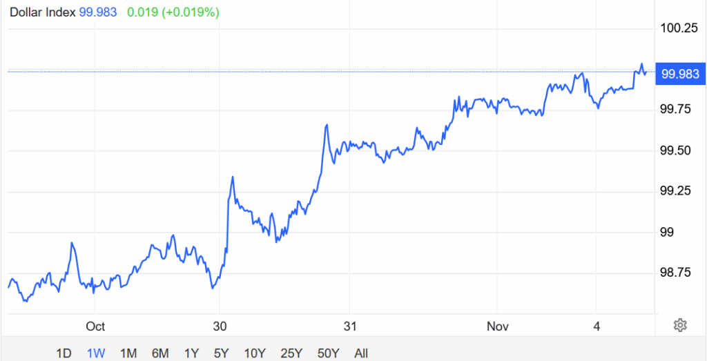 Chỉ số đô la Mỹ DXY dao động gần mức cao nhất trong ba tháng quanh 99,9 vào thứ Hai, khi giới giao dịch chờ đợi các dữ liệu khu vực tư nhân quan trọng trong tuần này — được kỳ vọng sẽ mang lại cái nhìn mới về thị trường lao động và nền kinh tế Mỹ nói chung — trong bối cảnh chính phủ Mỹ đã bước sang tháng thứ hai của tình trạng đóng cửa mà chưa có dấu hiệu được giải quyết.