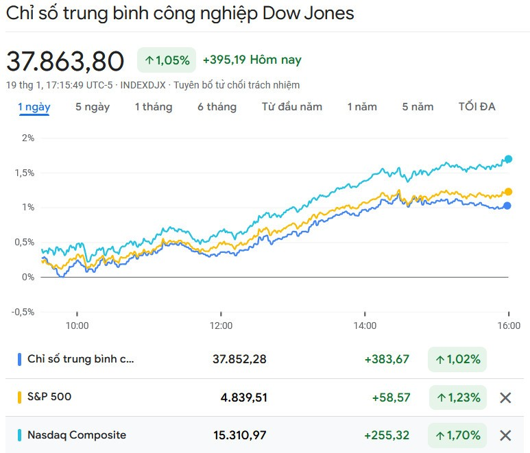 Trong khi, chỉ số Dow Jones, cộng 395,19 điểm (tương đương 1,05%) lên 37.863,80 điểm. Chỉ số Nasdaq Composite tiến 1,70% lên 15.310,97 điểm. Chỉ số Nasdaq-100 tăng 1,95% lên mức cao kỷ lục.
