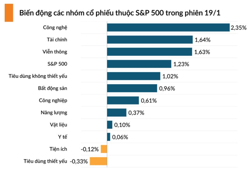 Trên S&P 500, 9/11 nhóm cổ phiếu tăng điểm, dẫn đầu là Công nghệ (+2,35%) và Tài chính (+1,64%). Chỉ 2 ngành Tiện ích và Tiêu dùng không thiết yếu giảm với sự điều chỉnh nhỏ (dưới 0,4%).
