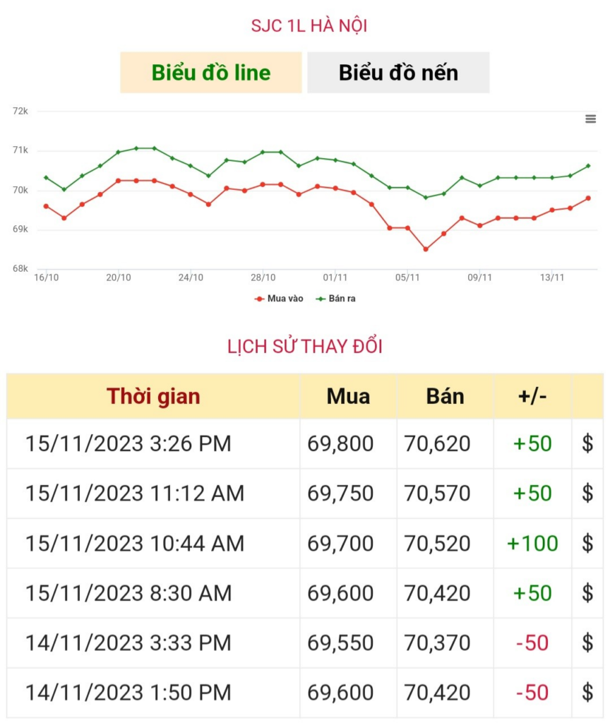 Cụ thể, lúc 15h30, ngày 15/11, SJC tại Hà Nội niêm yết giao dịch mua – bán ở mốc 69,80 – 70,62 triệu đồng/lượng, tăng 200.000 đồng/lượng giá mua và bán so với thời điểm mở cửa.