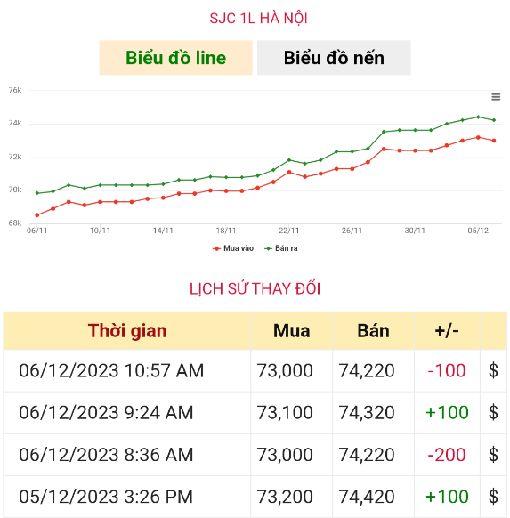 Cụ thể, thời điểm 15h, ngày 6/12, giá vàng miếng tại SJC Hà Nội niêm yết giao dịch mua – bán ở mức 73,00 – 74,22 triệu đồng/lượng, đi ngang giá mua và bán so với thời điểm mở cửa.