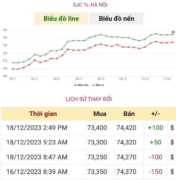 Cập nhật lúc 15h20, ngày 18/12, SJC Hà Nội niêm yết giao dịch mua – bán hiện ở mức 73,40 – 74,42 triệu đồng/lượng, tăng 150.000 đồng/lượng chiều mua và bán so với mở cửa sáng nay.