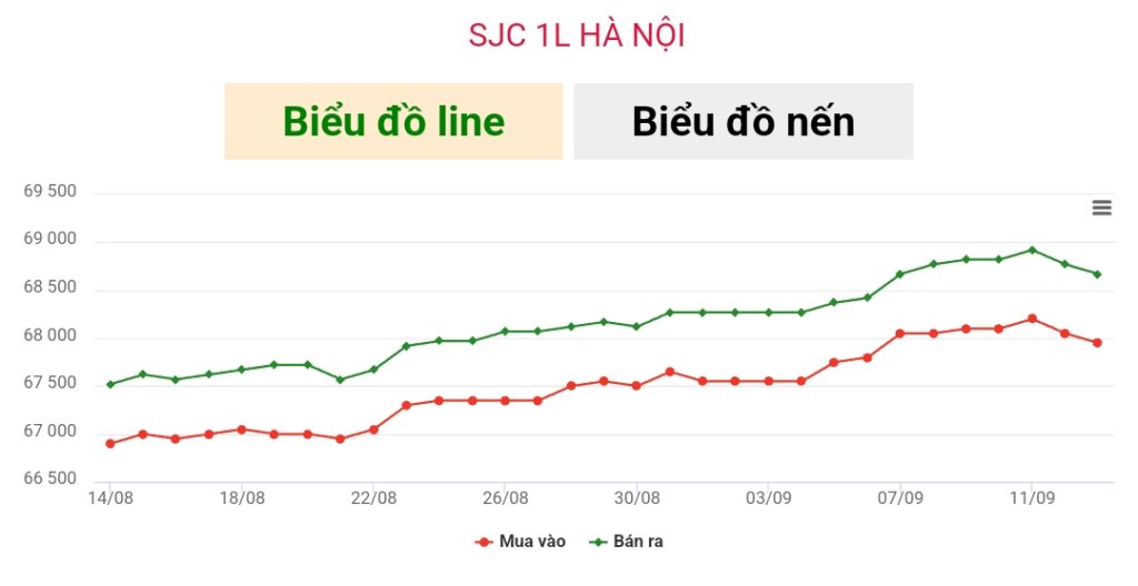 Cập nhật lúc 14h30, ngày 13/9, SJC tại Hà Nội được công ty CP SJC Sài Gòn niêm yết giao dịch mua – bán ở mốc 67,95 – 68,67 triệu đồng/lượng, giảm 50.000 đồng/lượng chiều mua và bán so với giá mở cửa.