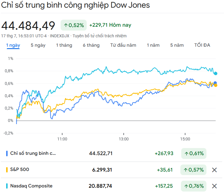 Phố Wall giao dịch đầy tích cực trong phiên giao dịch thứ Năm ngày 17/7 với hai chỉ số S&P 500 và Nasdaq phá đỉnh kỉ lục của năm 2025.