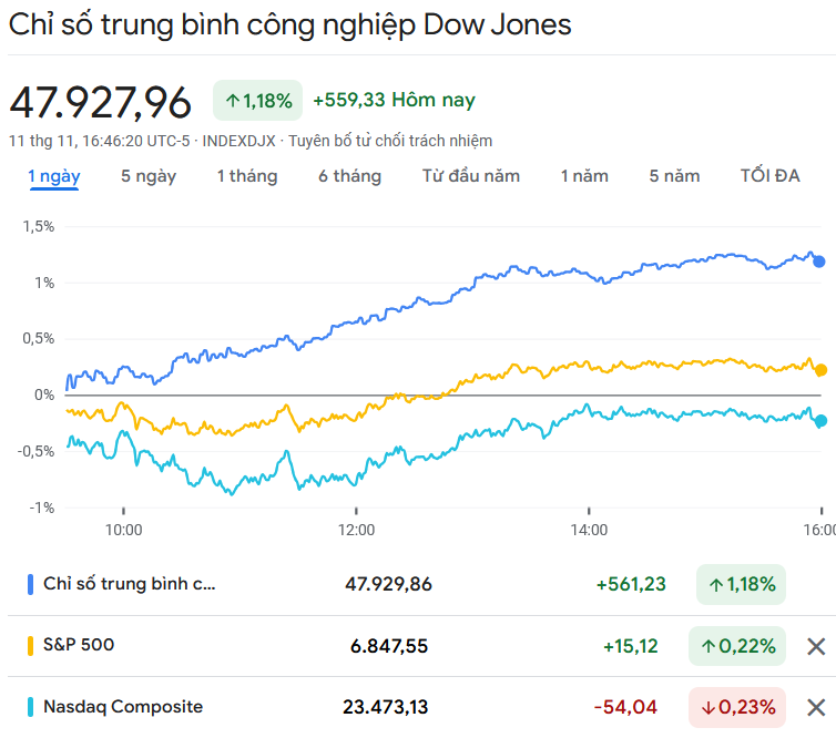 Đóng cửa phiên giao dịch thứ Ba ngày 11/11, chỉ số Dow Jones cộng 559,33 điểm (tương đương 1,18%) lên 47.927,96 điểm, với việc các nhà đầu tư mua vào nhiều cổ phiếu blue-chip, bao gồm các gã khổng lồ trong lĩnh vực chăm sóc sức khoẻ Merck, Amgen và Johnson & Johnson.