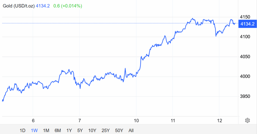 Kết thúc phiên giao dịch ngày 11/11, hợp đồng vàng giao ngay tiến 0,1% lên $4118,58/oz, sau khi đạt mức cao nhất kể từ ngày 23/10.