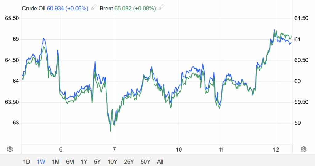 Kết thúc phiên giao dịch ngày 11/11, hợp đồng dầu Brent tiến 1,10 USD (tương đương 1,72%) lên 65,16 USD/thùng.