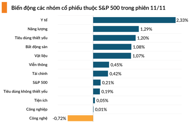 Bảng điện tử S&P 500 chứng kiến nhóm duy nhất giảm là Công nghệ. Trong khi đó, Y tế là cổ phiếu bứt phá manh nhất hôm 11/11.