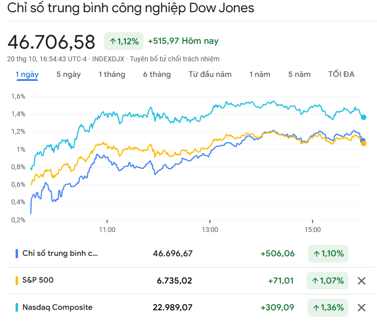 Đóng cửa phiên giao dịch thứ Hai ngày 18/10, chỉ số Dow Jones tăng 515,97 điểm (tương đương 1,12%) lên 46.706,58 điểm.
