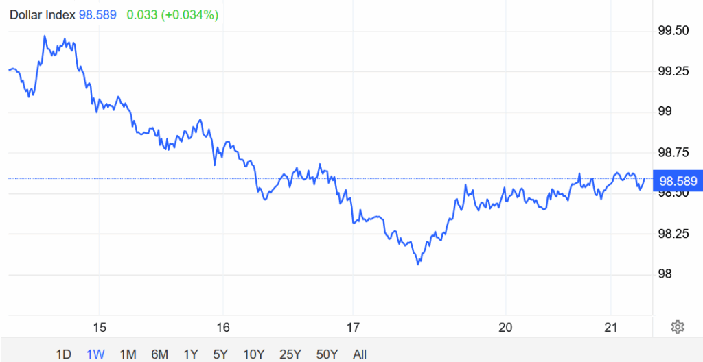 Chỉ số đô la Mỹ DXY tăng nhẹ lên 98,5 vào ngày thứ Hai khi sự suy yếu lan rộng của các đồng tiền thuộc nhóm G10 đã bù đắp phần nào tác động từ việc chính phủ Mỹ đóng cửa kéo dài, tình trạng bất ổn trong thương mại, và triển vọng Cục Dự trữ Liên bang (Fed) hạ lãi suất.