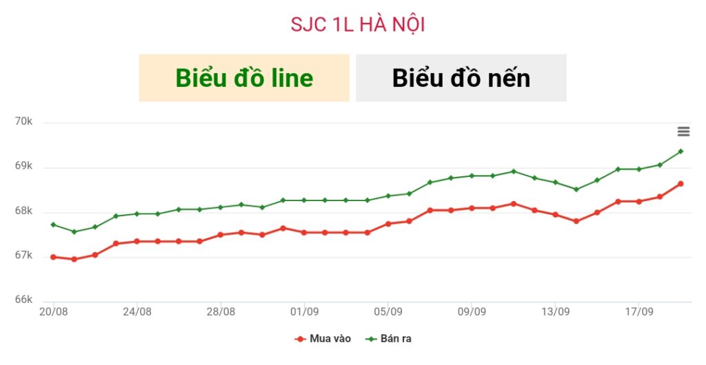 Cập nhật lúc 14h30, ngày 19/9, SJC tại Hà Nội được công ty CP SJC Sài Gòn niêm yết giao dịch mua – bán ở mốc 68,65 – 69,37 triệu đồng/lượng, tăng 150.000 đồng/lượng mua vào – bán ra so với giá mở cửa sáng nay.