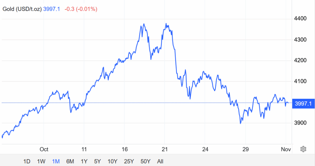 Kết thúc phiên giao dịch ngày 31/10, hợp đồng vàng giao ngay lùi 0,6% xuống 4.001,74 USD/oz. Giá vàng vọt 3,7% trong tháng này.