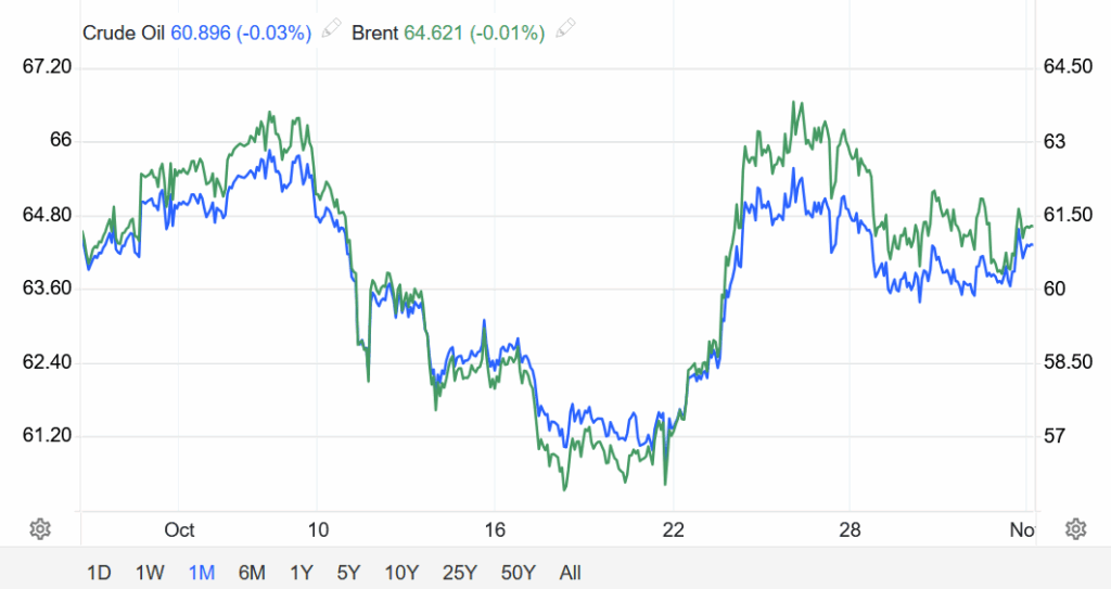 Giá dầu Brent và dầu WTI lần lượt giảm 2,9% và 2,3% trong tháng 10/2025 với việc Tổ chức các nước xuất khẩu dầu mỏ (OPEC) cùng với đồng minh tăng sản lượng.
