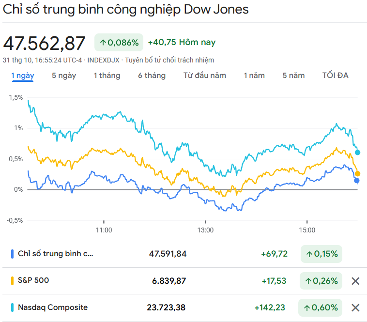 Chỉ số Dow Jones nhích 40,75 điểm (tương đương 0,09%) lên 47.562,87 điểm.