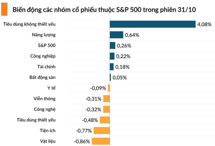Bảng điện tử S&P 500 chứng kiến mức tăng rất mạnh của cổ phiếu Tiêu dùng không thiết yếu.