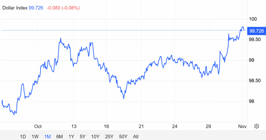 Chỉ số đô la Mỹ DXY tăng phiên thứ ba liên tiếp vào thứ Sáu, tiến sát mốc 99,8 — mức cao nhất kể từ đầu tháng 8 — và đang trên đà kết thúc tháng 10 với mức tăng khoảng 1,8%, được hỗ trợ bởi lập trường cứng rắn hơn từ Cục Dự trữ Liên bang (Fed).