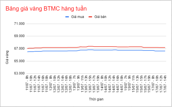 BTMC, niêm yết giao dịch mua – bán ở mốc 66,62 – 67,18 triệu đồng/lượng, giá mua đứng nguyên, giá bán giảm 20.000 đồng/lượng so với giá mở cửa.
