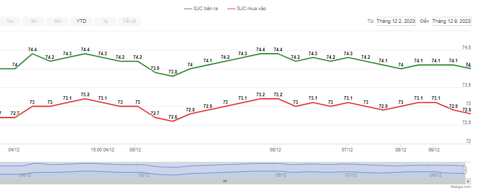 Tuy nhiên, sau khi giá vàng thế giới “hạ nhiệt” thì giá vàng miếng cũng quay đầu giảm mạnh. Có thời điểm trong phiên 5/12, giá vàng đã mất mốc 74 triệu đồng, nhưng lại hồi phục nhanh chóng ngay sau đó để trở lại mốc 74 triệu đồng và cuối cùng chốt tuần với xu hướng giảm nhưng nhiều thương hiệu vẫn giữ được mốc chủ chốt này.