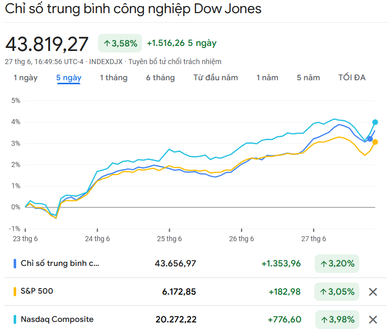 Đóng cửa phiên giao dịch thứ Sáu ngày 27/6, chỉ số S&P 500 tiến 0,52% lên mức cao kỷ lục 6.173,07 điểm. Vào đầu phiên, S&P 500 đã tăng 0,76% lên mức cao 6.187,68 điểm, phá vỡ mức kỷ lục trước đó là 6.147,43 điểm.