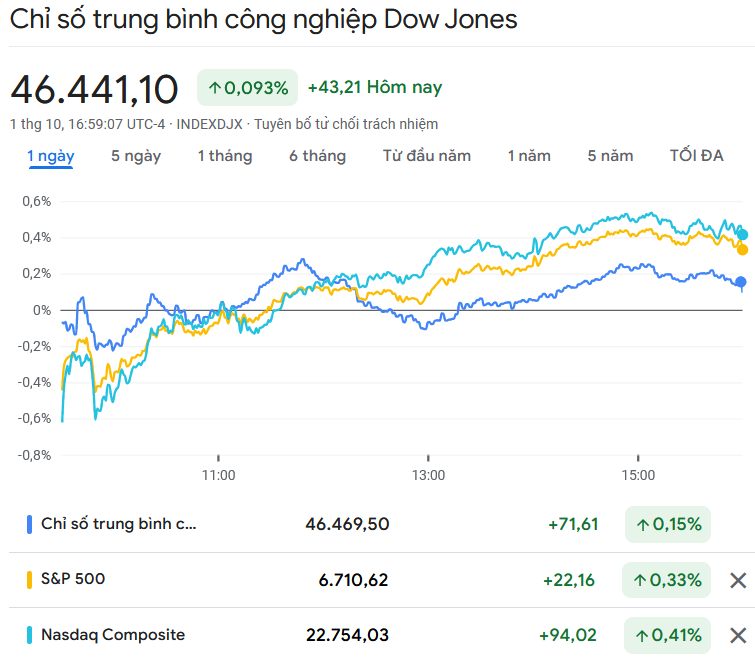 Chỉ số trung bình công nghiệp Dow Jones tăng 43 điểm, tương đương 0,09%, kết thúc ở mức 46.441 điểm.
