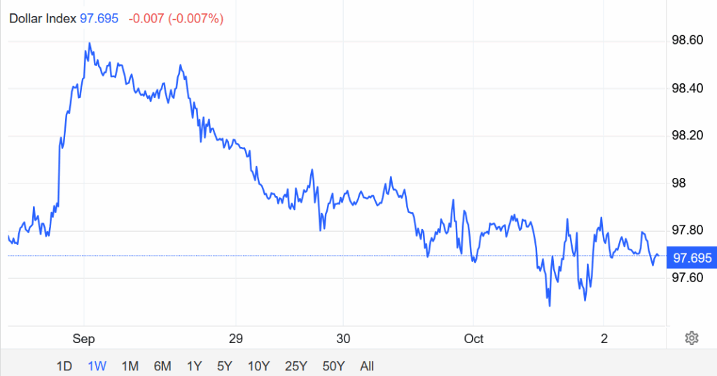 Chỉ số đô la Mỹ DXY giảm xuống 97,6 vào ngày thứ Tư, đánh dấu chuỗi giảm bốn ngày liên tiếp khi dữ liệu việc làm yếu kém của Mỹ cùng với tình trạng chính phủ đóng cửa đã làm gia tăng kỳ vọng về việc Cục Dự trữ Liên bang (Fed) cắt giảm lãi suất.