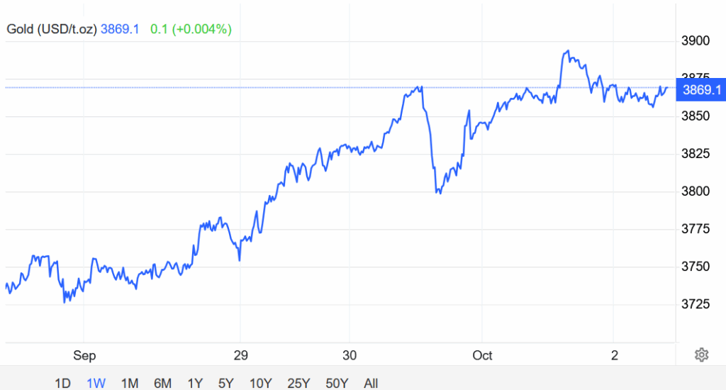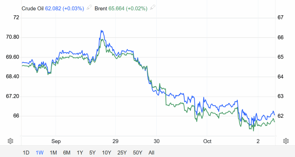 Trong khi đó, việc chính phủ Mỹ phải đóng cửa, bắt nguồn từ bế tắc ngân sách liên quan đến chi tiêu y tế, có thể trì hoãn việc công bố các báo cáo kinh tế quan trọng như đơn xin trợ cấp thất nghiệp hàng tuần và số liệu việc làm phi nông nghiệp tháng 9, khiến thị trường thêm bất ổn. Khoảng 750.000 nhân viên liên bang sẽ bị cho nghỉ việc tạm thời (furlough), gây thiệt hại khoảng 400 triệu USD mỗi ngày.