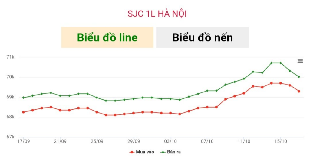 Cập nhật lúc 14h30, ngày 17/10, SJC tại Hà Nội niêm yết giao dịch mua – bán ở mốc 69,30 – 70,02 triệu đồng/lượng, giảm 150.000 đồng/lượng cả hai chiều mua – bán so với đầu giờ sáng cùng ngày.