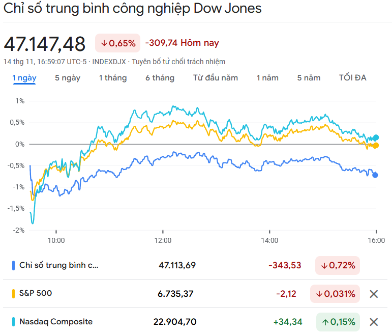 Cùng chiều, chỉ số Dow Jones mất 309,74 điểm (tương đương 0,65%) còn 47.147,48 điểm.