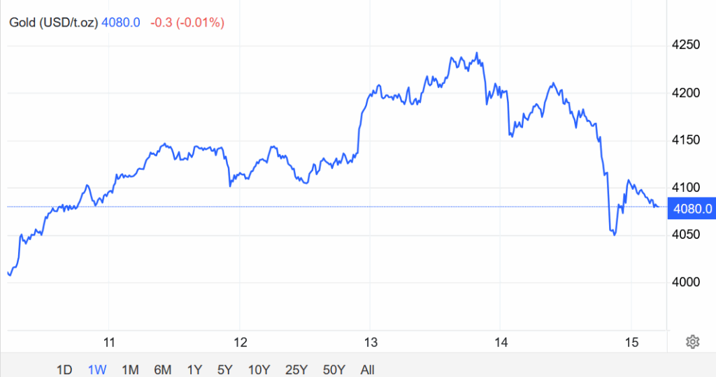 Kết thúc phiên giao dịch ngày 14/11, hợp đồng vàng giao ngay lùi 1,82% xuống $4095,16/oz, sau khi chạm mức $4211,06/oz vào đầu phiên. Giá vàng đã tăng 3,7% trong tuần này.