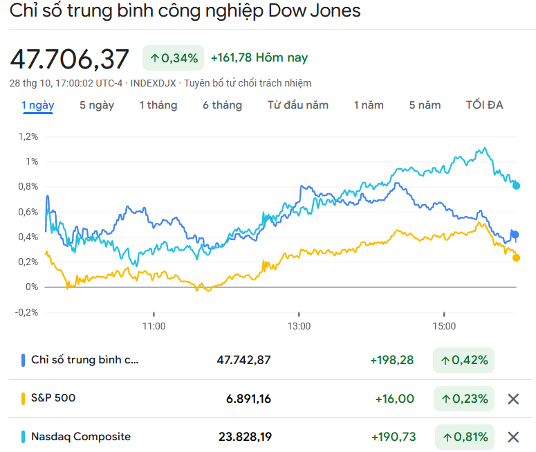Chỉ số Dow Jones tăng 161,78 điểm (tương đương 0,34%) lên 47.706,37 điểm.