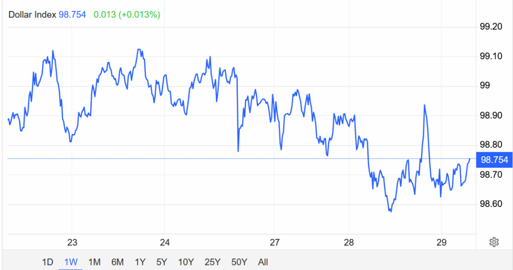 Chỉ số đô la Mỹ DXY giảm xuống quanh mức 98,6 vào thứ Ba, chạm đáy trong một tuần khi tâm lý lạc quan về khả năng đạt được thỏa thuận thương mại Mỹ – Trung làm suy yếu nhu cầu trú ẩn an toàn đối với đồng bạc xanh, trong khi các nhà đầu tư chuẩn bị cho cuộc họp chính sách của Cục Dự trữ Liên bang (Fed).