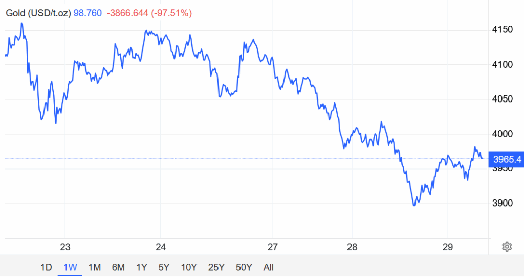 Kết thúc phiên giao dịch ngày 28/10, hợp đồng vàng giao ngay lùi 0,7% xuống $3952,87/oz, sau khi ghi nhận mức thấp nhất kể từ ngày 06/10.