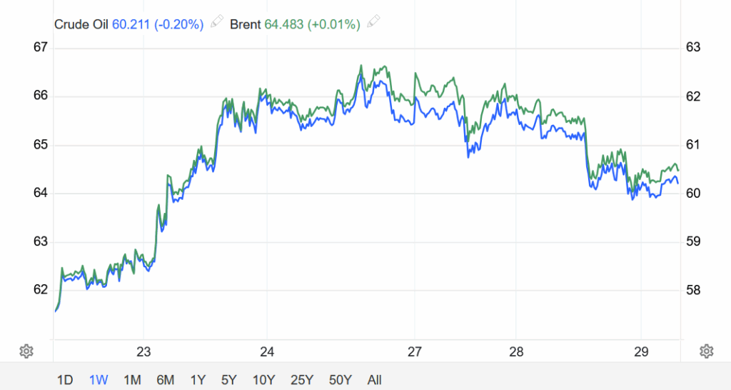 Kết thúc phiên giao dịch ngày 28/10, hợp đồng dầu Brent lùi 1,22 USD (tương đương 1,9%) xuông 64,40 USD/thùng.