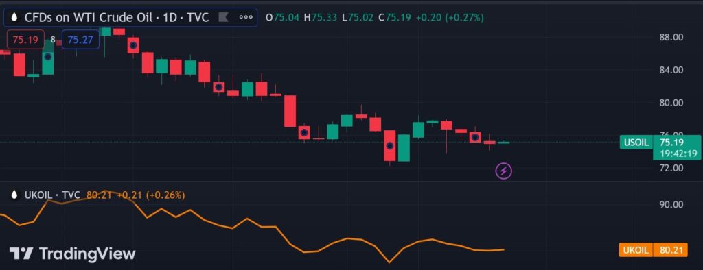 Hợp đồng dầu thô tương lai Brent giảm 60 xu (tương ứng 0,74%) xuống 79,98 USD/thùng. Hợp đồng dầu thô tương lai WTI tại Mỹ rớt 68 xu (tương ứng 0,9%) đóng cửa tại 74,86 USD/thùng.