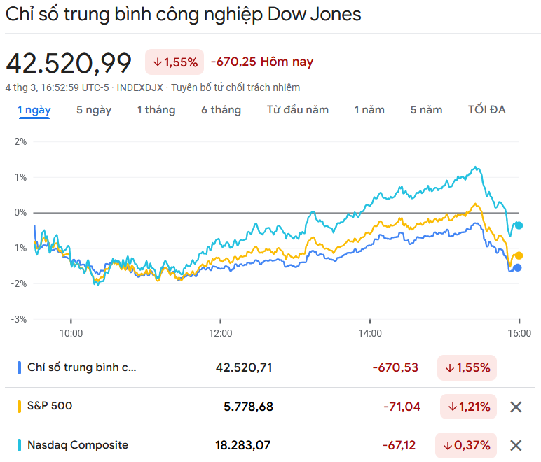 Đóng cửa phiên giao dịch thứ Hai ngày 4/3, chỉ số Dow Jones rớt 670,25 điểm (tương đương 1,55%) xuống 42.520,99 điểm, sau khi giảm gần 650 điểm trong phiên trước đó.