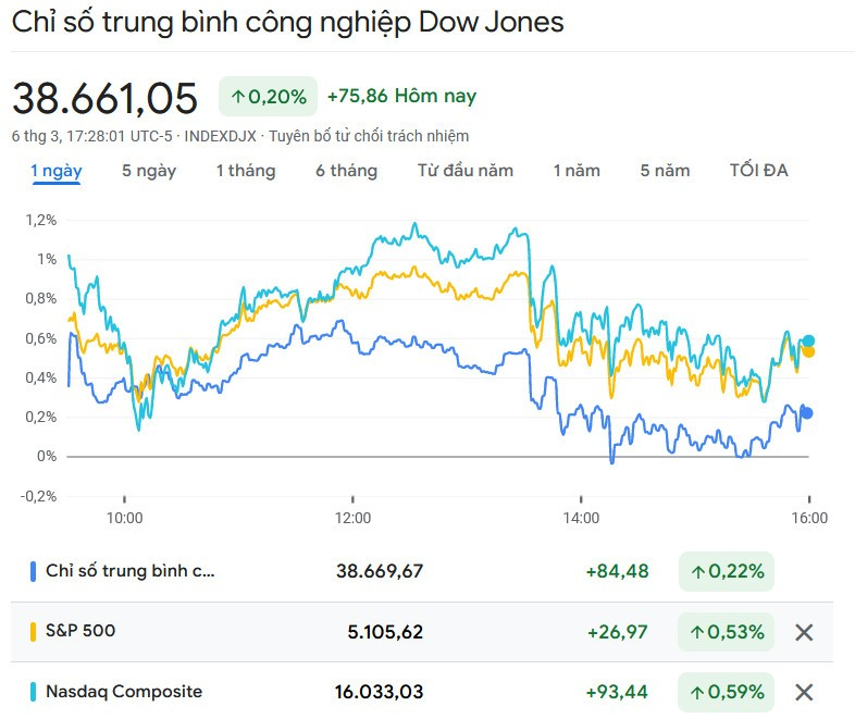 Kết phiên giao dịch thứ Tư 6/3, chỉ số S&P 500 tiến 0,51% lên 5.104,76 điểm, còn chỉ số Nasdaq Composite cộng 0,58% lên 16.031,54 điểm. Chỉ số Dow Jones tăng 75,86 điểm (tương đương 0,2%) lên 38.661,05 điểm.