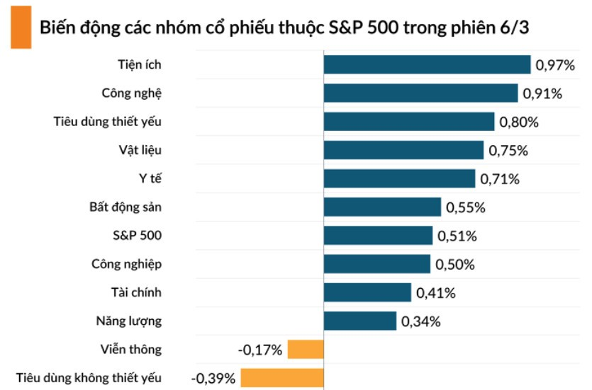 Sắc xanh lan tỏa khắp thị trường với cổ phiếu Tiện ích và Công nghệ nổi bật nhất trên S&P 500. Ở chiều giảm, cổ phiếu Viễn thông và Tiêu dùng không thiết yếu giảm chưa đầy 0,4%.