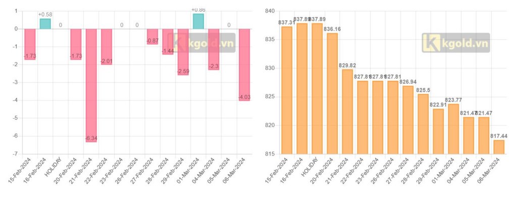 Quỹ tín thác vàng hàng đầu thế giới SPDR Gold Trust bán ra một lượng lớn vàng trong ngày thứ Tư. Quỹ xả 4,03 tấn, đưa lượng nắm giữ giảm về 817,44 tấn vào cuối ngày 6/3.