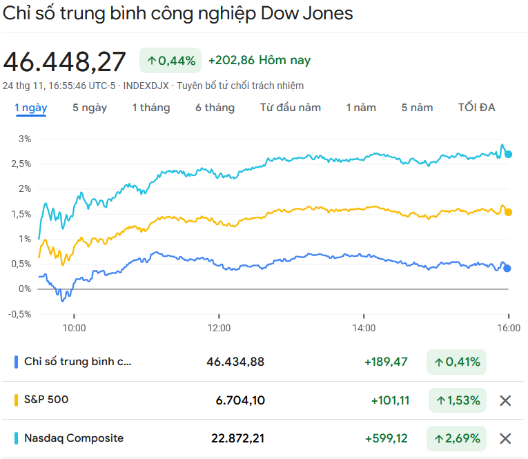 Chỉ số Dow Jones tăng 202,86 điểm (tương đương 0,44%) lên 46.448,27 điểm.