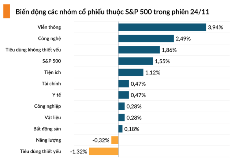 Đóng cửa phiên giao dịch thứ Hai ngày 24/11, chỉ số S&P 500 tiến 1,55% lên 6.705,12 điểm.