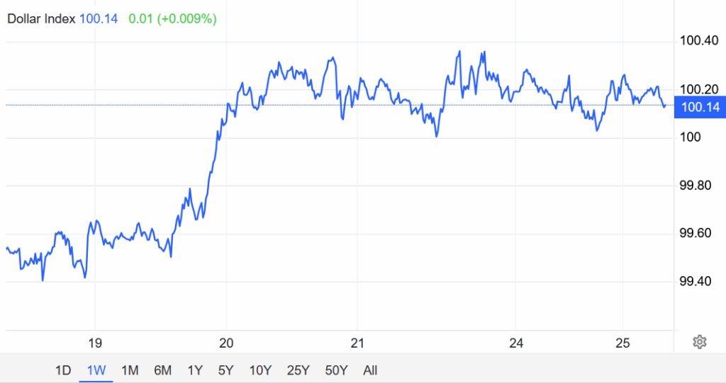 Chỉ số DXY duy trì trên mốc 100 vào thứ Hai, tiếp tục neo gần mức cao nhất trong sáu tháng khi các nhà đầu tư tiếp tục đánh giá triển vọng chính sách tiền tệ của Cục Dự trữ Liên bang Mỹ (Fed). Thống đốc FOMC Christopher Waller nhắc lại quan điểm rằng việc cắt giảm lãi suất trong tháng 12 sẽ là lựa chọn hợp lý để đối phó với tỷ lệ thất nghiệp gia tăng, trong khi Chủ tịch Fed New York John Williams cho biết hôm thứ Sáu rằng khả năng hạ lãi suất trong ngắn hạn vẫn còn.