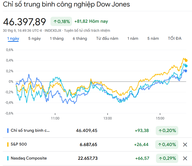 Chỉ số Dow Jones tăng 81,82 điểm (tương đương 0,18%) lên 46.397,89 điểm, mức đóng cửa cao kỷ lục.