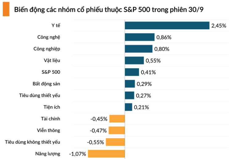 Bảng điện tử S&P 500 ghi nhận sắc xanh của 7/11 nhóm ngành. Cổ phiếu Năng lượng tiếp tục là nhóm thể hiện yếu nhất. Ở chiều ngược lại Y tế bứt phá mạnh.