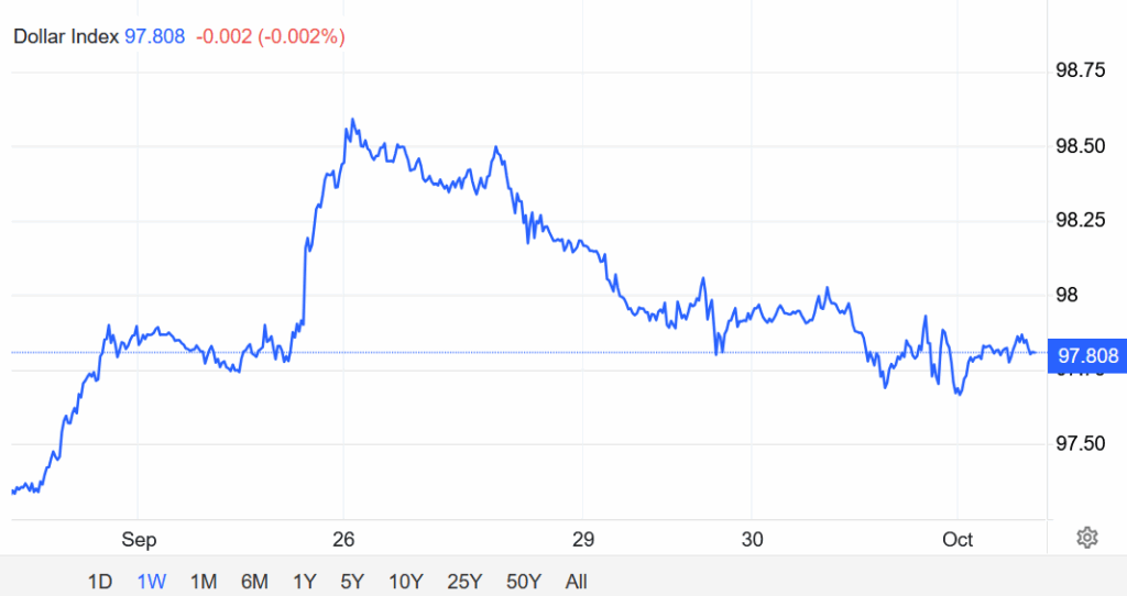 Chỉ số đô la Mỹ DXY giảm xuống dưới mức 98 vào thứ Ba, kéo dài chuỗi giảm ba phiên liên tiếp trong bối cảnh lo ngại về khả năng chính phủ Mỹ phải đóng cửa, có thể khiến báo cáo việc làm hàng tháng tuần này bị trì hoãn. Nếu không đạt được thỏa thuận tạm thời vào phút chót giữa Đảng Cộng hòa và Đảng Dân chủ, nguồn tài trợ cho chính phủ sẽ hết hạn vào nửa đêm.