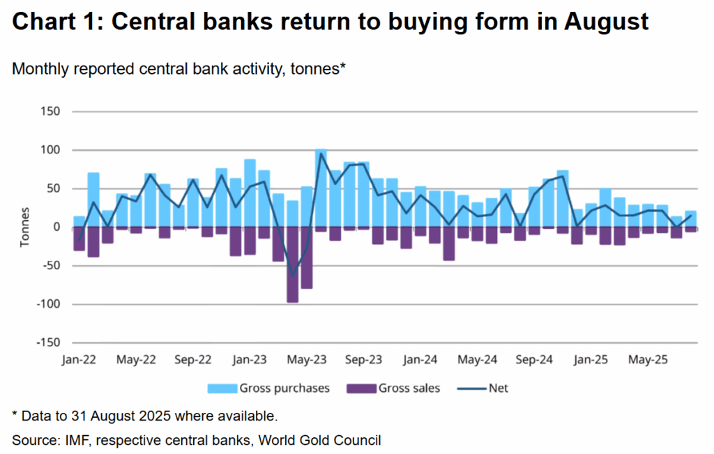 Các ngân hàng trung ương đã bổ sung ròng 15 tấn vàng vào dự trữ toàn cầu trong tháng 8, dựa trên dữ liệu từ IMF và các ngân hàng trung ương. Con số này phù hợp với mức mua ròng hàng tháng từ tháng 3 đến tháng 6, đánh dấu sự quay lại sau khi dự trữ toàn cầu không đổi trong tháng 7.