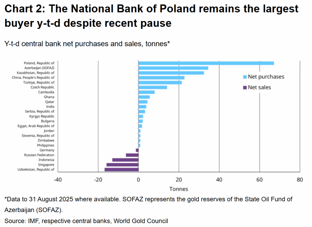 Ngân hàng Quốc gia Ba Lan (NBP) vẫn là người dẫn đầu năm 2025 với 67 tấn vàng mua thêm, nâng tổng dự trữ lên 515 tấn vào cuối tháng 8. Mới đây, NBP xác nhận sẽ nâng mục tiêu tỷ trọng vàng trong dự trữ ngoại hối từ 20% lên 30%, đồng nghĩa khả năng sẽ tiếp tục mua thêm trong thời gian tới, dù khẳng định tốc độ mua sẽ phụ thuộc vào điều kiện thị trường.