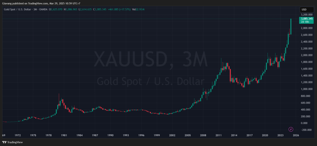 (GVNET) Tuần này, thị trường vàng vàng không chỉ giữ mức hỗ trợ ban đầu trên $3000/oz mà còn tăng mạnh, tiếp cận vùng $31000. Thị trường vàng đang trên đà kết thúc 3 tháng đầu năm với mức tăng ấn tượng 18% – mức tăng giá theo quý lớn nhất kể từ tháng 7/1986.