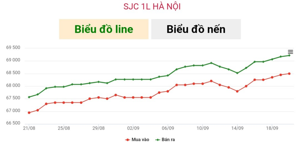 Cập nhật lúc 15h, ngày 20/9, SJC tại Hà Nội được công ty CP SJC Sài Gòn niêm yết giao dịch mua – bán ở mốc 68,50 – 69,22 triệu đồng/lượng, đi ngang cả hai chiều mua – bán so với giá mở cửa.